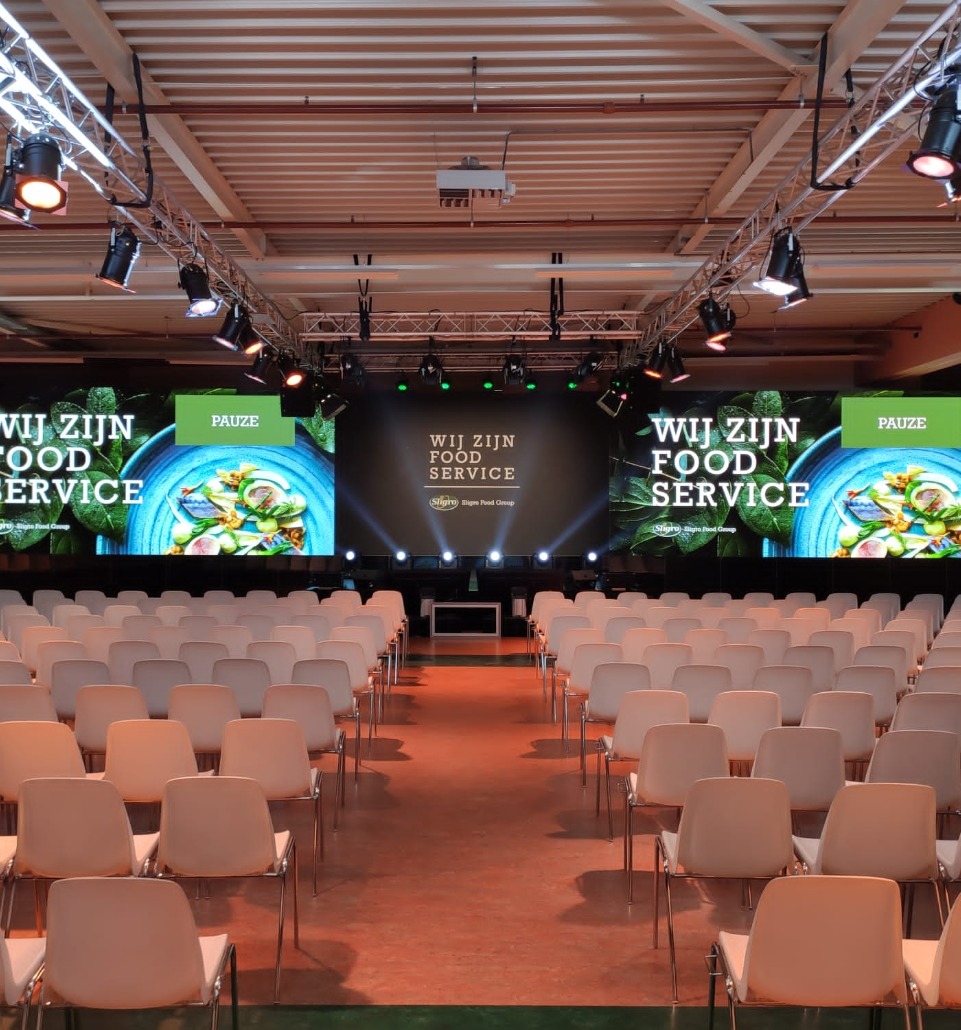 Sligro Food Group has been known as the quality wholesaler in food for many years. Everything revolves around experience. With live cooking demos, tastings and an atmospheric presentation, Sligro pampers its guests. This is only possible with a group of 800 loyal suppliers who are just as passionate as Sligro itself. During Sligro’s supplier day, they were put in the limelight and included in the plans for the coming years. Bridge Event Facilities took care of this business event down to the last detail. We transformed the presentation room in the head office into a real conference hall. With atmospheric white chairs, widescreen LED wall, decor printed cloths and a real interpreters’ booth for proper translation for the foreign guests.
