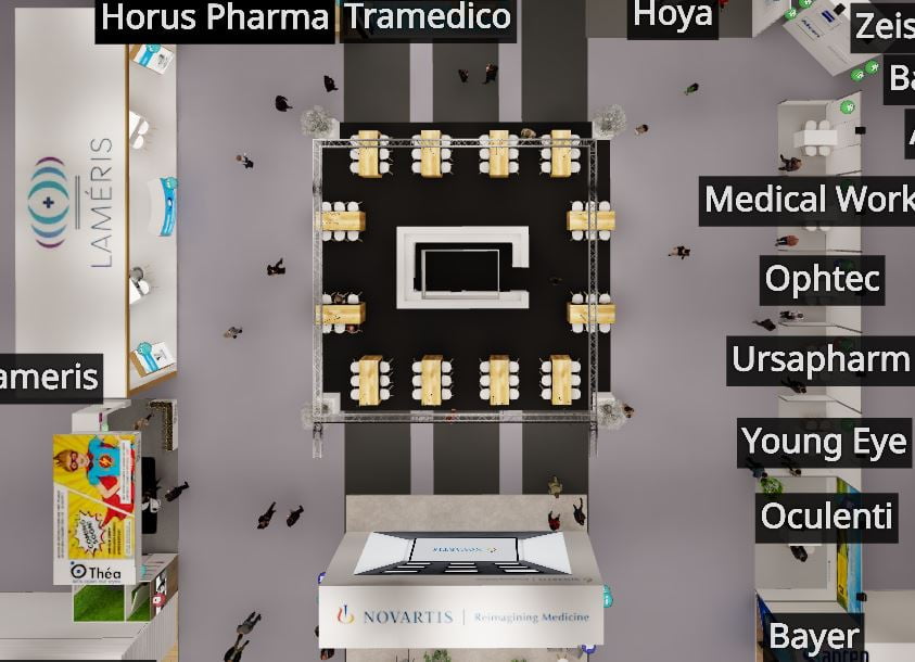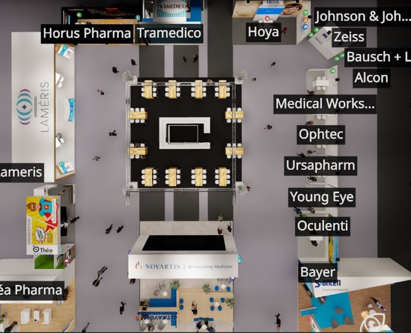 Een bezoeker die de virtuele beurs plattegrond bekijkt, ziet boven aanzichten van de stands met daarin de stand namen in een standaard lettertype.