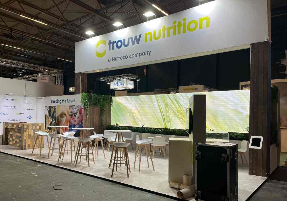 Als bezoekers van de Trouw Nutrition stand ergens niet omheen konden, was het de enorme, standbrede LED wall, eveneens verzorgd door Bridge Event Facilities. We maken daarvoor gebruik van Aluvision LED Tiles. Het voordeel van deze screens is dat ze haarscherp zijn, levensechte kleuren vertonen en afgeronde buitenhoeken hebben. Dit maakt dat ze zo naadloos tegen elkaar te plaatsen zijn, dat het één enorm scherm lijkt. Naast LED Walls kunt u ons inschakelen voor elke vorm van expotechniek: beeld, licht, geluid, time-laps films, rigging. Bridge Event Facilities is thuis in elke vorm van expotechniek: licht, geluid, beeld, time-lapss films en rigging.